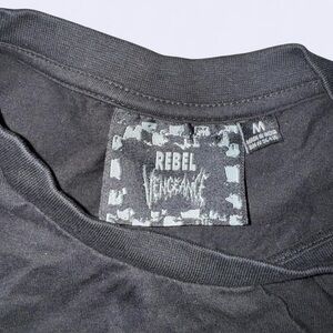 Black Rebel tee with small “V” chest logo and sequined skull graphic on back. Size M. Approx. 18.5” pit to pit.