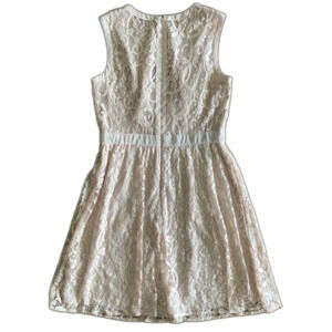 Sleeveless, a-line skirt hits right above knee, rounded neckline, back zip and hook & eye closure, fitted bodice, ornate floral lace with solid lining in beige/rose cream color, dry clean only, light wear.