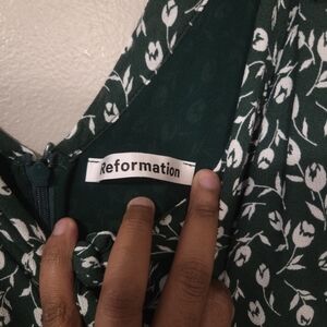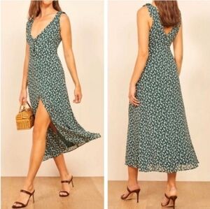 The Reformation Women's Harper Emerald Green Floral Midi Dress in size 2 is a stylish A-line dress perfect for various occasions such as formal events, parties, weddings, and casual outings. This sleeveless dress features a v-neckline and a zip closure, with a flattering midi length and a beautiful floral pattern. Made of viscose material, the dress is lined and features adjustable details, making it comfortable and versatile for all seasons. Perfect for young, stylish women looking for a chic and feminine wardrobe option.