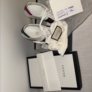 Gucci Size 39 New Ace Bee Sneakers — US Size 9. White sneakers with red and green stripes and red and green heels. Worn twice, unfortunately too small. Includes dust bags, box, and extra Gucci laces.