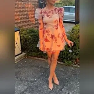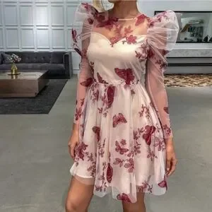 Elegant mini dress with floral and butterfly design. Sheer puff sleeves. Perfect for special occasions.