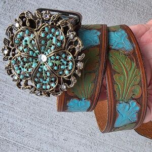 The belt is crafted from genuine leather with embossed floral detailing and hand-painted accents in turquoise and green tones, giving it a beautiful boho / western / vintage aesthetic.