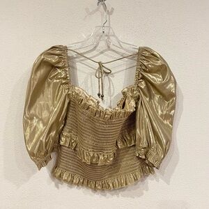 60% nylon, 40% metallic. Dry clean only. Pull-on styling. Ruffle detail. Puff sleeve. Smocked throughout.