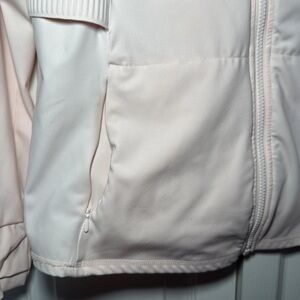 Pale pink, zip front jacket. Elastacized mid jacket. Size is an XL, but I wear an XL and always felt this to be a little tight. Long sleeved with thumb holes. Side zip pockets. Pit to pit 18 1/2”.shoulder to shoulder 22”, length 24” waist 171/2”z