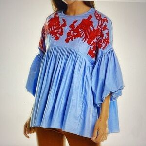 Anthropologie Hemant & Nandita Lianna embroidered chambray top featuring striking red phoenix embroidery across the yoke, balanced by a soft, flowy silhouette. Statement bell sleeves and artisan-style detailing give this piece an elevated boho feel that works effortlessly from casual to styled.
