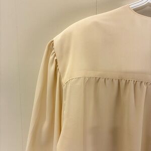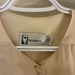 Beautiful vintage button-up blouse from Prophecy in a soft cream color. Features structured shoulder pads, a flowy silhouette, and a subtle sheen. Tagged size 14 Petite but fits more like a modern 10-12