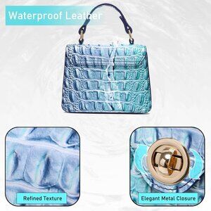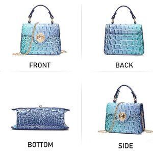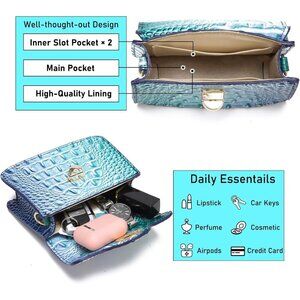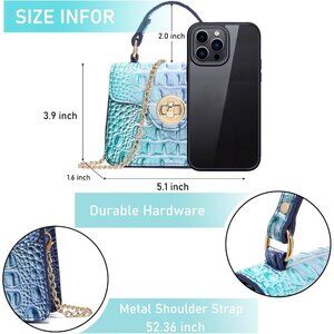 Features: Crafted with luxurious crocodile vegan leather, this durable and stylish mini clutch feels soft to the touch and elevates any outfit. Its compact size (5.1" L, 1.6" W, 3.9" H) makes it perfect for carrying just your essentials. The twist lock closure keeps everything secure, while the silver metal accents add a touch of elegance. Comes with a long metal shoulder strap (52.36"), making it versatile as a clutch or a shoulder bag.