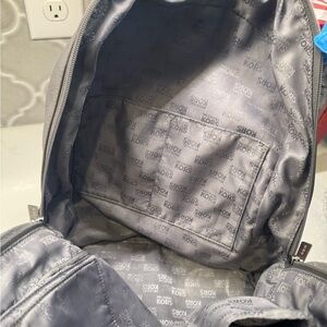 Interior is fully lined with signature Michael Kors logo fabric and includes slip pockets plus a zip pocket for easy organization. Front zip pocket adds quick-access storage.