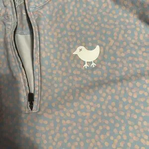 Vibrant pullover with blue and pink pattern. Features Bad Birdie logo. Ideal for casual outings. There is a gap in the stitching on the back by the neck line. I took a picture of it. It doesn’t affect the the shirt.