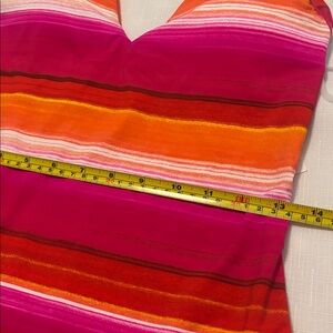 Stylish swimsuit with vibrant pink and orange hues. Perfect for a bold beach look. This is new never worn soft cups tie back adjustable removable cups see photo for measurements