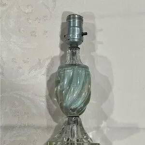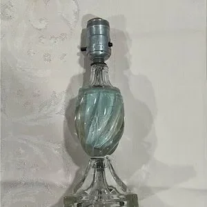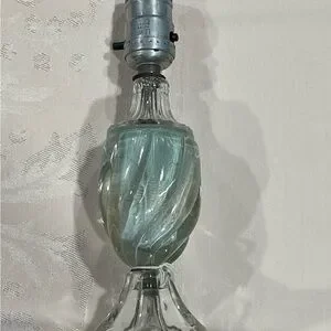 Antique Glass Table Lamp. Mid-Century Modern. It works! Likely made from Murano Glass. Shaped in a Hollywood Regency type style. Features a unique light blue swirl pattern in the center. Neoclassical Design! Ornate Base! Prominent ribbing giving a twisted swirl look! Perfect for any table, mantle, t stand, night stand, etc…! Gives off a nice warm light. Perfect for soft lighting, a night light, reading light, etc…! Offers Encouraged!!