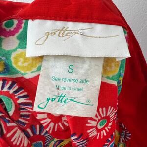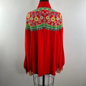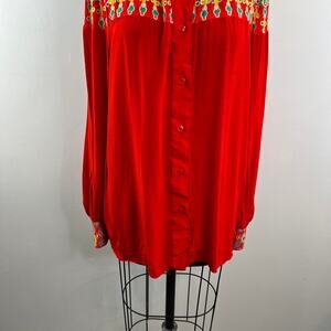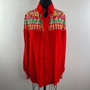 Gottex Red Top Floral Embroidered Collared Balloon Sleeve Button-Up Size Small S