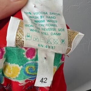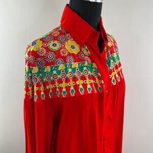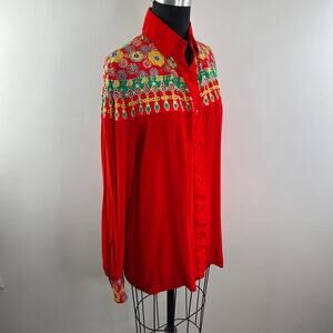 VINTAGE Gottex Red Top Floral Embroidered Collared Long Sleeve Button-Up Small S