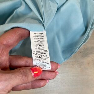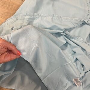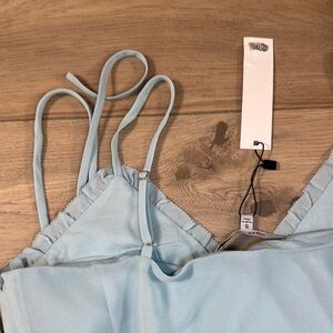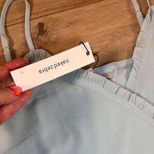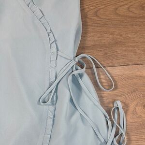 Naked Zebra light blue ruffle wrap dress with adjustable spaghetti straps. Tie waist and snap on chest area to keep it closed. Outer layer is sheer with a shiny soft liner underneath.