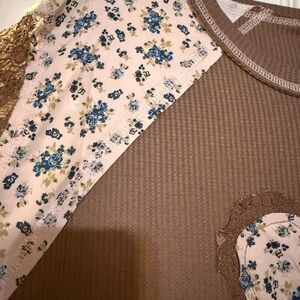 Charming top with floral applique. Lace sleeves add elegance. Perfect for casual wear.