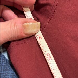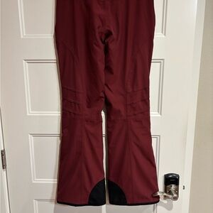 Versatile women’s ski pants in deep red. Features black accents and button details. Ideal for active wear. Inseam: 31 inches, waist: 15 inches.