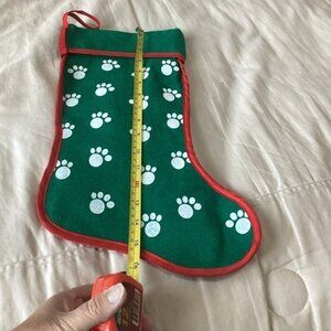 Christmas stocking, likely designed for pets due to the paw print pattern. It is traditionally hung on Christmas Eve for Santa Claus to fill with small gifts.