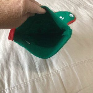 Design: Green with white paw prints and red trim.