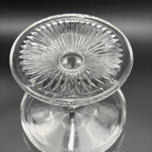 The Riverside Glass Compote Thumbprint Band Clear EAPG Antique is an elegant and vintage candy dish made of clear glass. With a unique thumbprint band design, this unmarked piece exudes a charming charm that adds a touch of sophistication to any table setting or decorative display. Perfect for serving candies or displaying small trinkets, this antique-inspired dish is sure to be a standout piece in any collection of glassware.