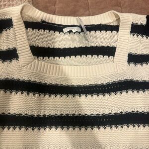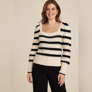 Stylish square neck sweater with bold black stripes. Cream base adds elegance. Perfect for versatile wear. NWT