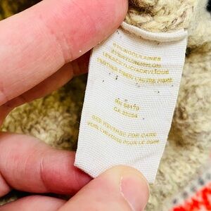 Y2K vibes. Wool blend babydoll cap sleeve knit sweater top. Fitted upper with more roomy lower. Scoop neckline with fully working 1/4 wooden button front. Orange red, gray and tan/cream colors throughout. Good stretch. Cozy. Warming. Bohemian. Boho.