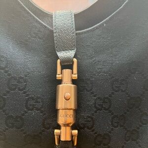 Chic Gucci shoulder bag in black with gold accents. Stylish and versatile design. Perfect for any occasion.