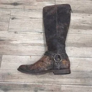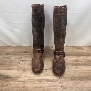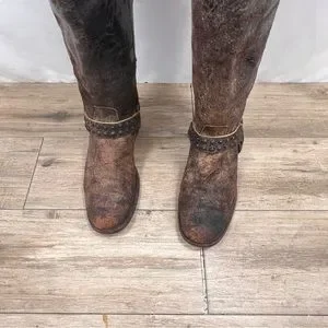 Stylish Frye tall boots. Low heel for added comfort. Rich brown leather. Studded strap detail. Perfect for any occasion.