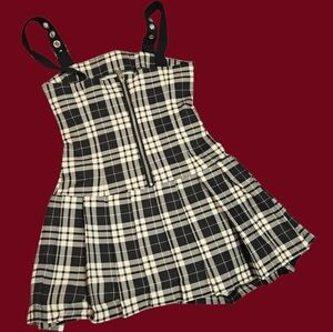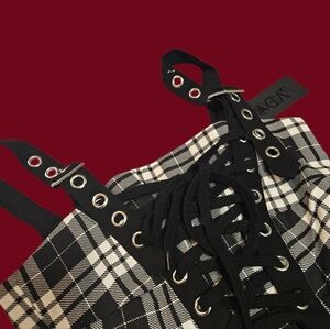 because all you learned in school was how to make hexes & exes! This phantasmic plaid mini dress features detachable overall straps, adjustable lace up sides, and a sweetheart neckline with lace up front