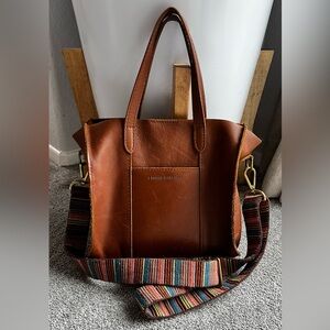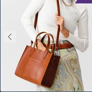 Stylish Portland Leather tote in honey brown. Perfect for everyday use. 9” tall x 9” wide x 5” deep.