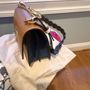 Stylish color block shoulder bag with gold accents. Features a tan / cream leather body, navy suede accent on side and bottom. Blue and brown braided strap. Perfect for any occasion. Nearly perfect! Used once or twice, no flaws. Comes with original dust bag which it has been stored in. Smoke and pet free home.