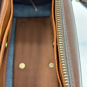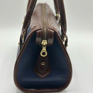 Elegant leather satchel with blue body and brown trim. Ideal for everyday use.