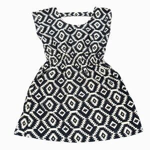 Pink Rose black and white Aztec print dress featuring a flattering fit-and-flare silhouette with an elastic waist for comfortable stretch and shape. Designed with cap sleeves, a scoop neckline, and a subtle back cutout detail. Lightweight and easy to wear—perfect for casual outings, summer events, or everyday styling.