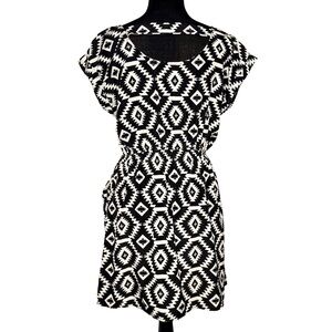 Pink Rose Aztec print dress in black and white featuring a fit and flare silhouette with elastic waist and cap sleeves. This boho-inspired geometric dress is lightweight and flattering, perfect for casual wear, summer outfits, festivals, vacations, or everyday styling. Great for fans of bohemian, classic, minimalist, or southwestern-inspired fashion looking for a comfortable women’s dress in size large.