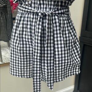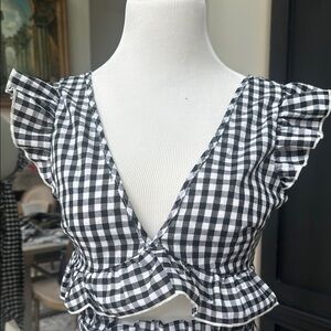 Chic black and white gingham short set with ruffle details. Features a tie waist for a flattering fit. Crop top adjustable tie back.