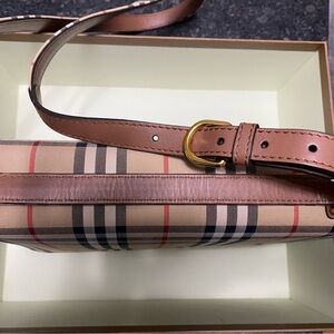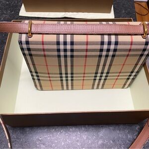 Timeless Burberry plaid can be worn as a shoulder or crossbody bag with brown leather accents. Was a generous gift that was too sensitive to return as it’s not my style. Never out of the box, complete w storage bag and more.