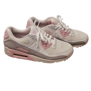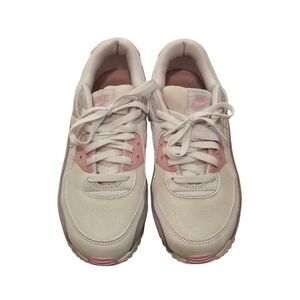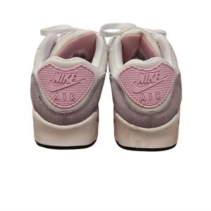 Womens Nike Air Max 90 low casual sneakers in white, grey, and pink. Size 9. Excellent pre-owned condition showing only minor signs of wear, as seen in photos. Smoke-free home. #nike #airmax90 #sneakers #womensshoes