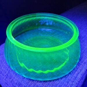 In great condition and glows under a black light. There is no Maker's Mark on the bottom. The rim has normal glass imperfections on the base of the candy dish. The lid of the candy dish, on the inside lip has a few minute rough spots that may be part of the glass making process. There are no large breaks, cracks, nor chips.