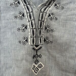 Stylish blue striped top with intricate embroidery. Perfect for casual outings.
