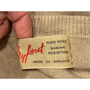 This Vintage Byford English 100% Wool Vest in beige is a preppy and academic-looking piece from the 1980s. Made in the United Kingdom, this slim-fitting vest features a secretary/Geek look and is crafted from high-quality wool. With a chest size of 34 inches and a size small, this original vest is perfect for everyday wear and adds a touch of retro charm to any outfit. Please see measurement photo. Excellent condition.
