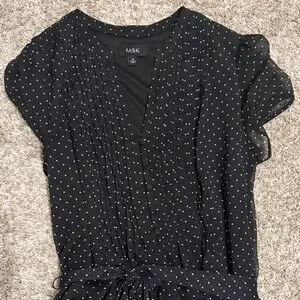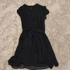 Chic black midi dress with white polka dots. Features a tie waist and short sleeves. Size 16. Worn twice. Pet free and smoke free home.