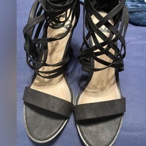Stylish black wedges with strappy design. Perfect for versatile wear.