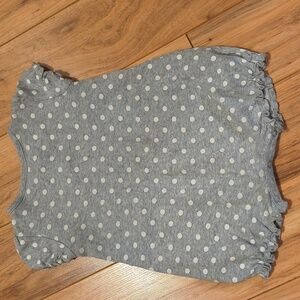 infant girl's onesie, short sleeves, snaps, elastic leg, size 6-9 months, grey with white polka dot print, pink bows, pink giraffe on the front
