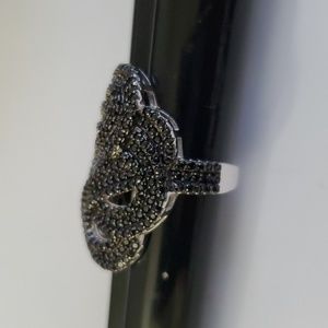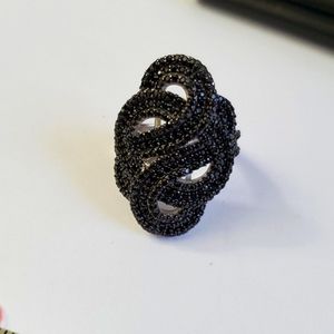 Description: This sterling silver statement ring is a bold celebration of elegance and drama. Adorned with a mesmerizing sea of black spinel (or possibly onyx) stones, the intricate looping design creates an eye-catching silhouette that exudes sophistication. Each stone sparkles with a dark, mysterious brilliance, perfectly complementing the sleek sterling silver setting.