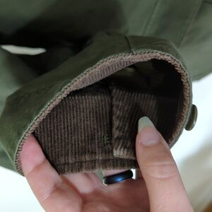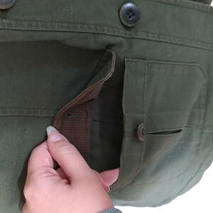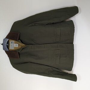 LL Bean chore barn coat in solid green size small. I do believe this is a men's, but the pit to pit measurement is about 21 inches. Shell is 100% cotton with corduroy collar. Quilted lining is polyester along with the insulation (thinsulate). Front pockets have button closure. There are extra buttons sewn inside. I do believe this is a modern piece and not vintage. Jacket is in very good pre-owned condition, from smoke free and pet free home