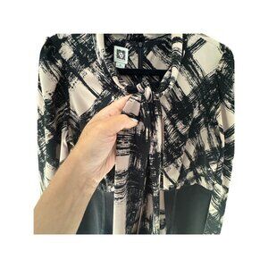 Anne Klein blouson top style neck tie front design midi dress with a black and tan abstract/geometric pattern on the top and a solid sheath/straight black skirt. The dress features long, sheer sleeves, and a tie-neck detail. Gently pre-loved condition.