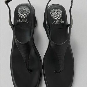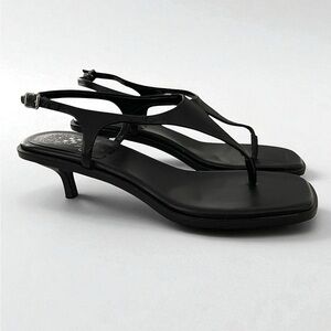 Vince Camuto black leather slingback sandals in a modern square-toe thong design. Size 8.5M. Features a comfortable 2” kitten heel and secure elastic slingback strap. Lightweight, minimal, and perfect for dress, work, or evening outfits.