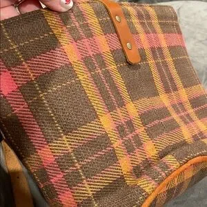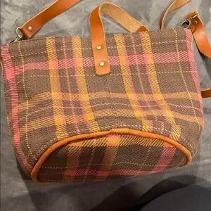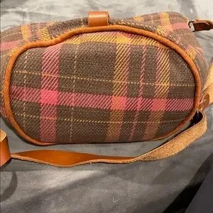 Discover the perfect blend of style and functionality with this chic plaid crossbody bag. Featuring a warm brown and pink plaid design with tan leather accents, it's an ideal choice for any occasion.