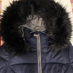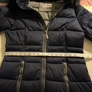 Women’s, size small, navy puffer coat by TanJay. Features a stylish faux fur trim. Great condition, longer length. Perfect for cold weather. Measurements in pictures.