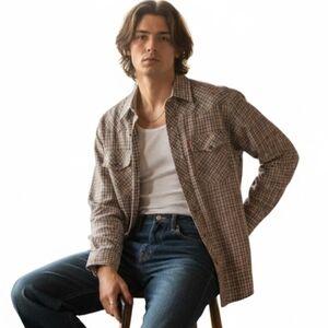 Vintage western plaid shirt by Levi's. Two button-flap chest pockets. All snap buttons. Made in Canada.