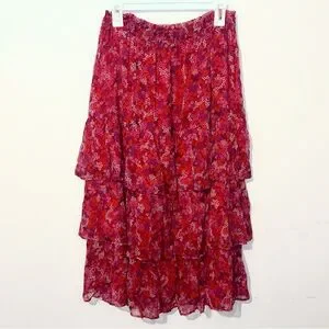 Gorgeous ditsy floral tiered midi skirt in vibrant shades of pink and purple. Lined, with elastic waist. Perfect for any occasion. Excellent condition